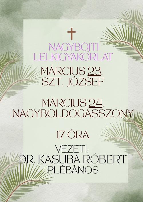 Nagyböjti lelkigyakorlat lesz március 23-án, hétfőn a Szent József templomban, és 24-én, kedden a Nagyboldogasszony templomban, 17 órától. A lelkigyakorlatot Dr. Kasuba Róbert plébános vezeti.