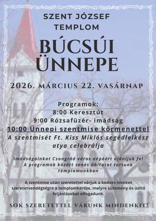 A Szent József templom búcsúünnepe március 22-én, vasárnap 8 órától lelki programmal veszi kezdetét, amelyben a Keresztutat végezzünk, majd a Rózsafüzért imádkozzuk. A búcsúünnepi szentmise 10 órakor kezdődik, amelynek szónoka Kiss Miklós segédlelkész lesz. A búcsú után tartandó agapéhoz szeretettel fogadunk sütemény és üdítő felajánlásokat! Ezen a napon a Nagyboldogasszony templomban 8 órakor lesz a szentmise.